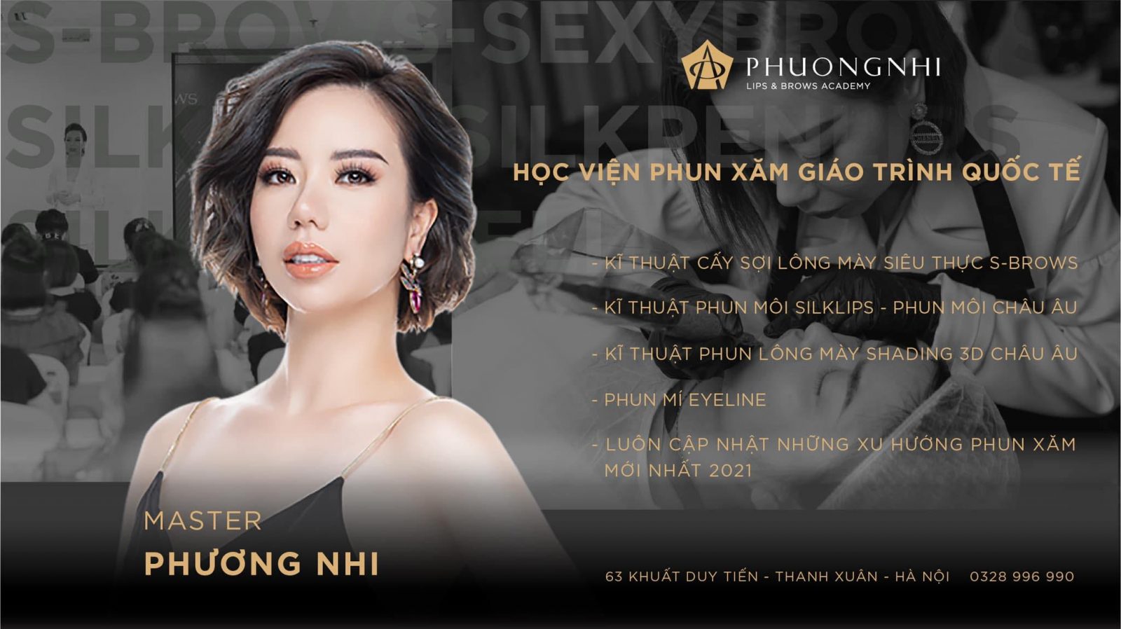 - Tại Phương Nhi Academy, học viên sẽ được học các kỹ thuật đang trở thành hot trend trong nghề như: Hairstrock, S – brow, đặc biệt tại học viện các bạn sẽ được học kỹ thuật phun môi Silk lips do Master Phương Nhi độc quyền đào tạo.