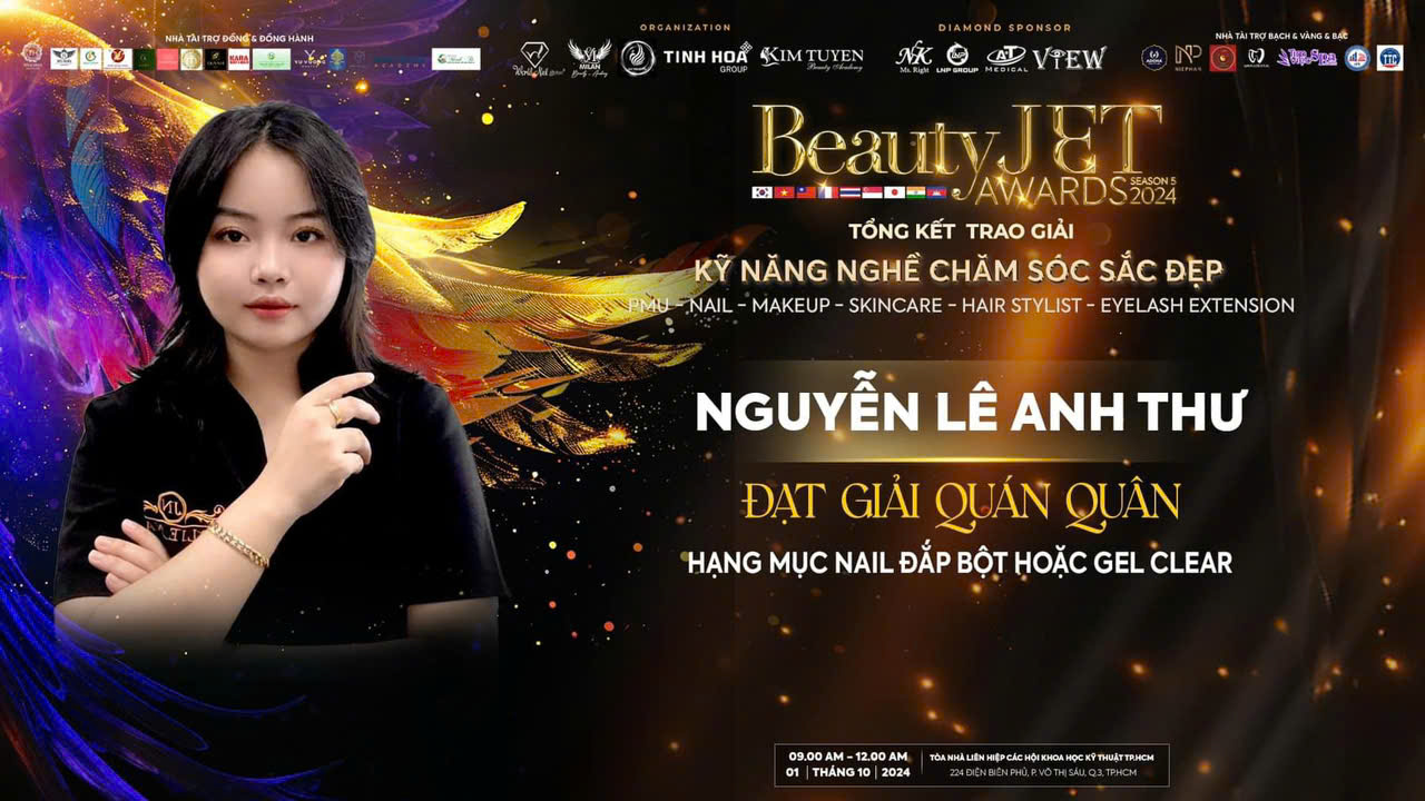 Cuộc thi Beauty Jet Sesion 5 năm 2024 đã chính thức khép lại với rất nhiều dư âm và cảm xúc. Đêm chung kết của cuộc thi đã xuất sắc gọi tên những thí sinh xứng đáng nhất. Và giải thưởng Quán quân đắp móng sơn gel đã gọi tên Nguyễn Lê Anh Thư.